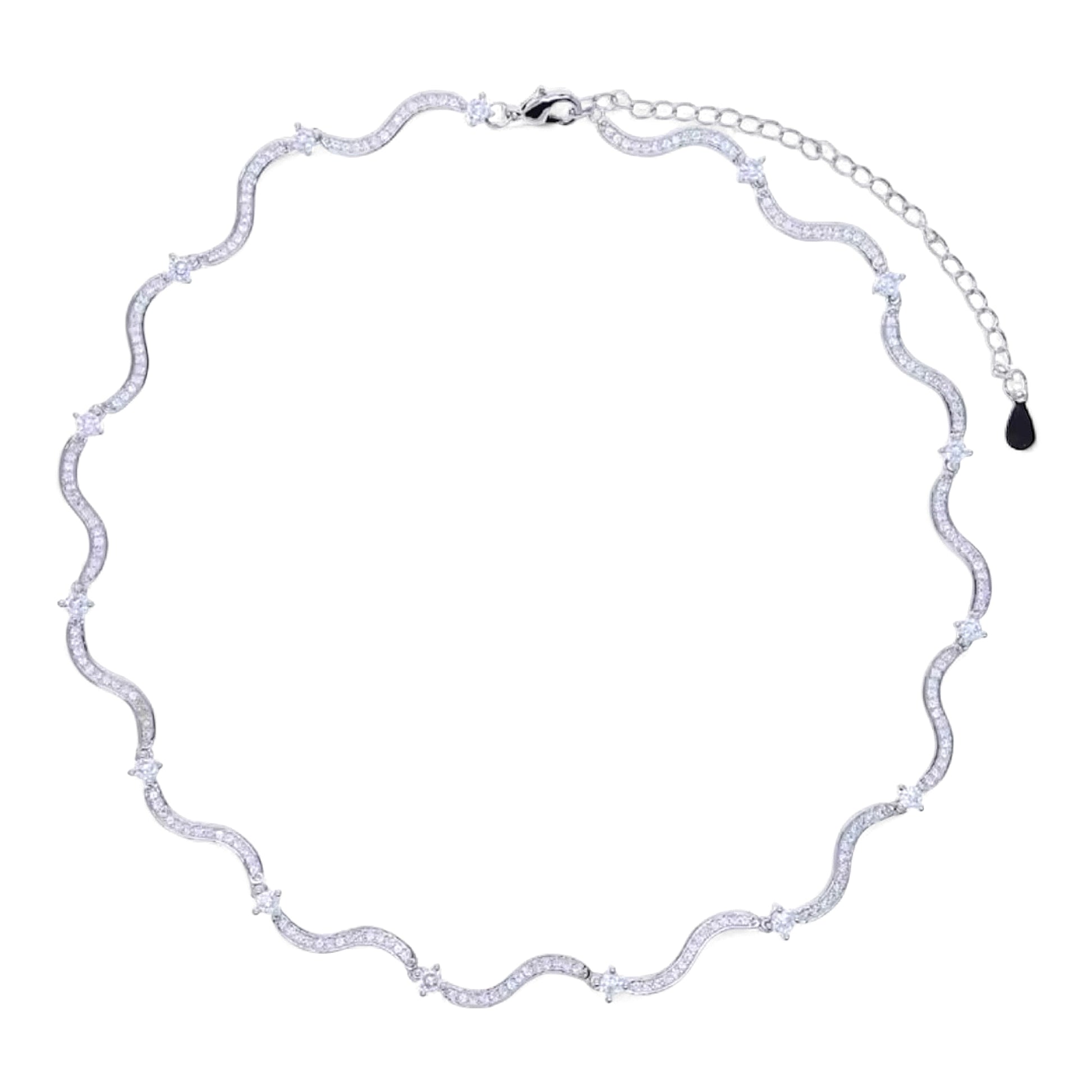 An elevated twist on the classic tennis silhouette, reimagined with fluid wave-like curves and a pavé finish that shimmers from every angle. Crafted in 14k gold plating and set with our signature Roma Crystals—cut from the same fine glass quality used in luxury jewelry—this necklace moves effortlessly from day to night. Wear it solo as a sleek statement or layered for modern elegance.
